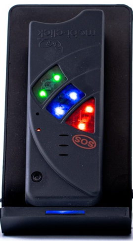 Diese Version des Geräts wird mit einer kabellosen Ladestation und einem USB-Ladegerät geliefert. Es verfügt über drei Tasten für Sprachanrufe an drei ausgewählte Personen.